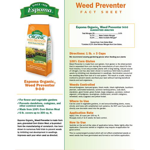 An organic product I endorse is Espoma’s Corn Gluten, a natural product that controls weeds from germinating from seed. It is available at Russell’s Tree & Shrub Farm, LLC, 9800 Transit Road, E. Amherst.